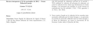 En una iniciativa sin precedentes, el movimiento de liberación del Sáhara Occidental ha remitido el acuerdo UE-Marruecos de libre comercio ante el Tribunal Europeo de Justicia. La noticia se publicó muy discretamente hace tres días en el diario oficial de la UE.http://www.wsrw.org/webpics/2013-02-27/tn_recurso_fp.jpg February 27, 2013 at 04:23PM http://www.wsrw.org/lES